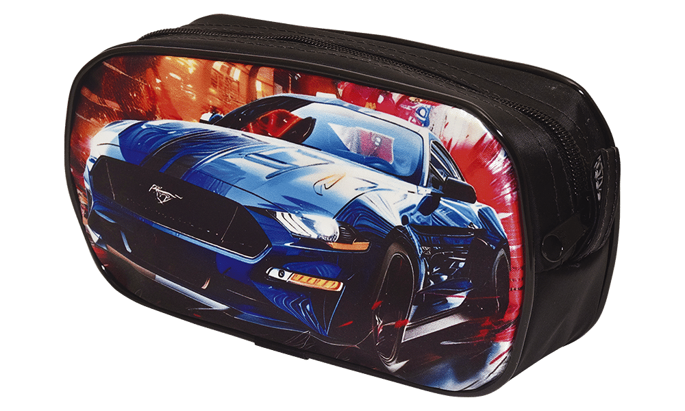 Coleção exclusiva de estojo escolar estampado de carrinhos.
